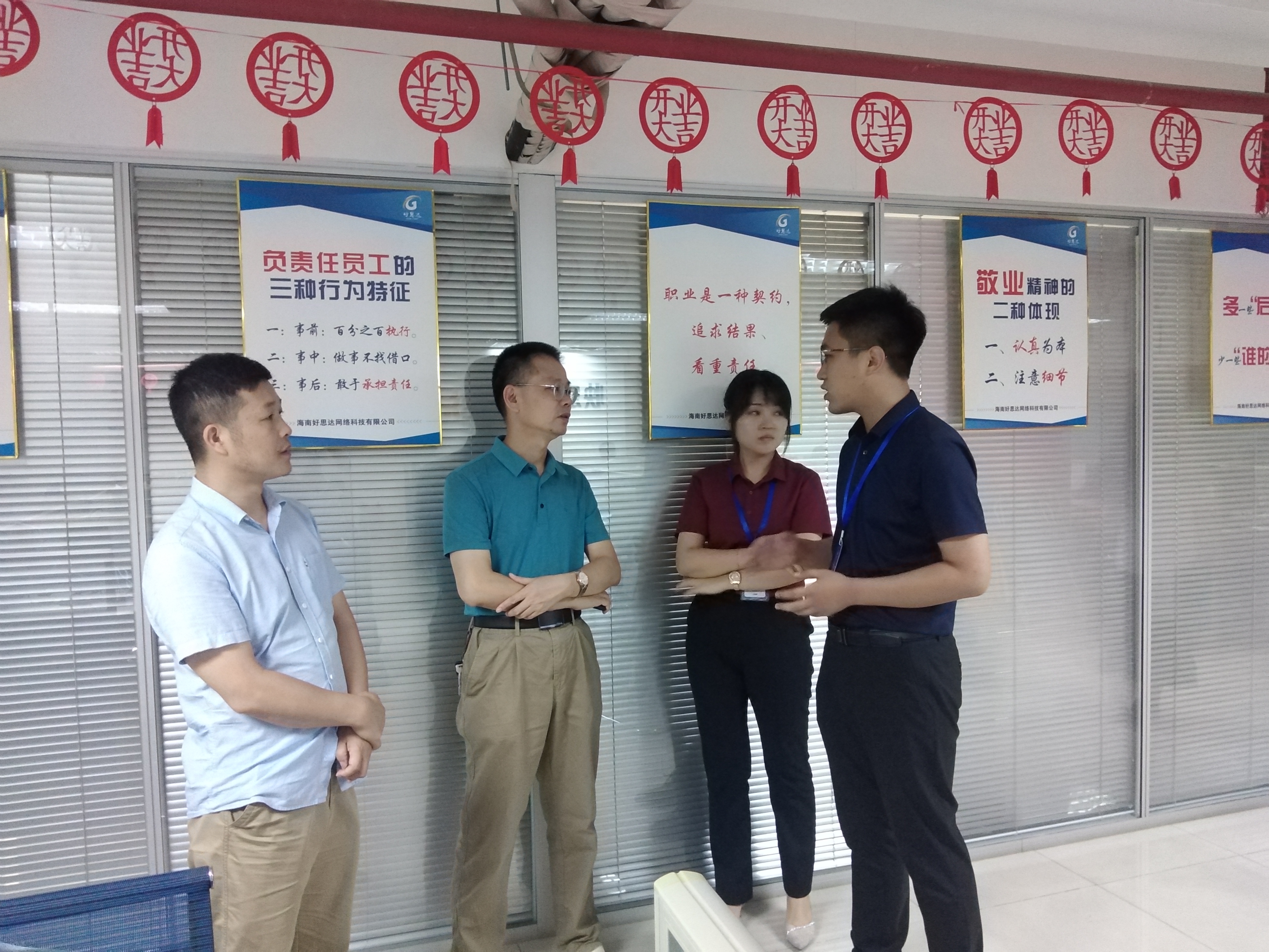 好思达人事经理王晨曦,好思达项目经理董长春高级工程师会见了公司领导,详细介绍了挂职教师的工作情况和公司应届毕业生的顶岗实习情况,王忠经理对好思达公司在教师挂职、员工顶岗实习等方面的合作表示满意。随后王忠经理、康东副经理与海南好思达总经理吉小明进行进一步的交流。 双方围绕产教融合、校企合、共建产业公司等问题交换了意见。