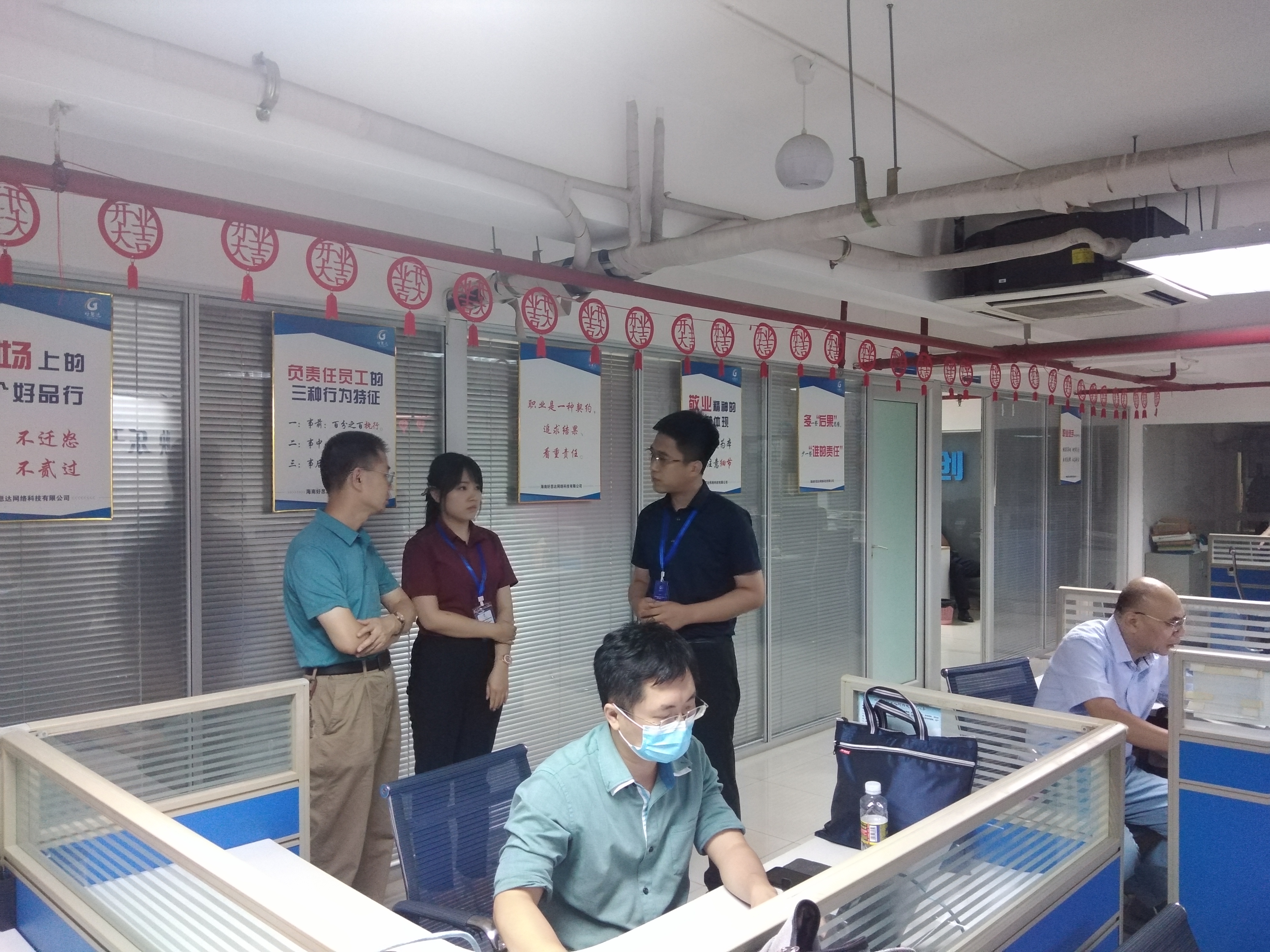 2021年7月14日下午,WilliamHill中文官方网站经理王忠、副经理康东到海南好思达网络科技有限公司开展调研,看望公司挂职锻炼教师团队和30多名毕业顶岗实习员工。