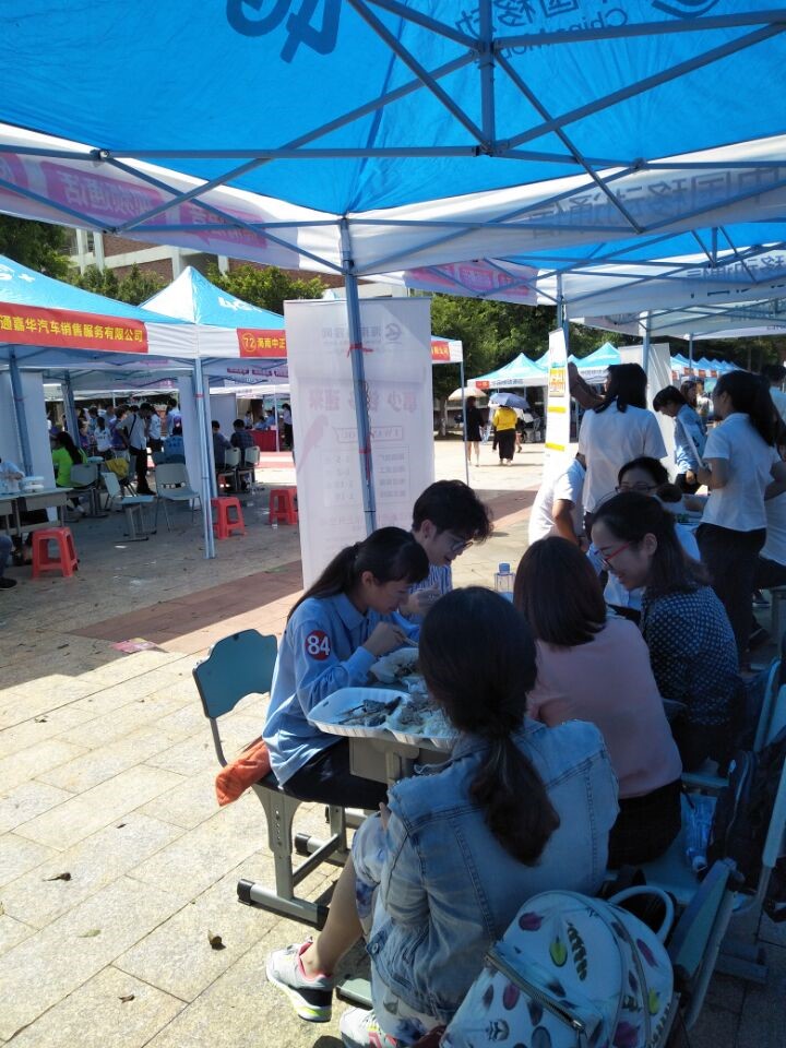 本次招聘会第二大亮点特色鲜明。本次招聘会共有240个助聘员穿上统一印制“海经贸志愿者”统一浅蓝色着装,分两排站在通道两旁欢迎企业代表。11点半,每位助聘员为前来招聘的企业代表送工作餐并以企业代表一同就餐,企业代表像回到了家一样,谈笑中既温暖又延续了招聘工作。