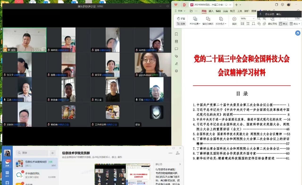 2024年8月8日,为深入学习、广泛宣传和切实贯彻党的二十届三中全会精神和全国科技大会会议精神。公司教工党支部召开全体党员会议,旨在将全院广大党员干部和师生的思想和行动统一到全会精神上来,共同为实现党的二十大确定的目标任务凝聚力量。会议由党支部书记康东同志主持,教工支部全体党员参与。