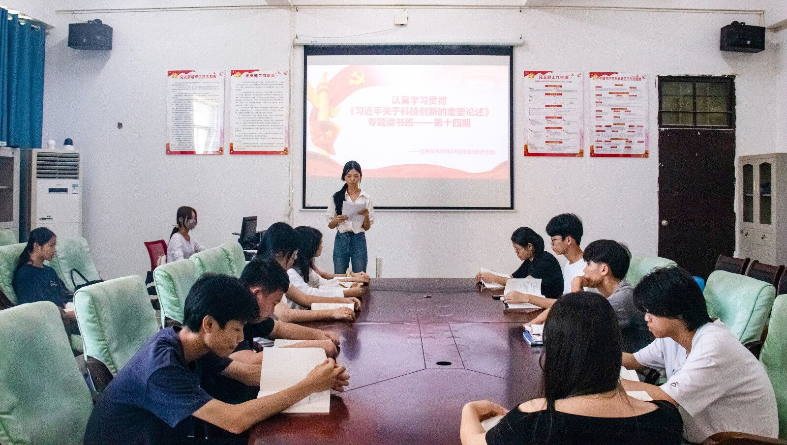 活动开始,周秀芸同学指出今年全国两会上,科技创新成为焦点,习近平总书记指出“科技创新和产业创新是发展新质生产力的基本路径”,凸显其在国家发展、民族复兴中的关键作用。随后她带领同学们初步学习了《深入学习习近平关于科技创新的重要论述》,并结合同学们所学专业内容提问“作为网络专业员工,如何在‘四个面向’中找准专业定位?”