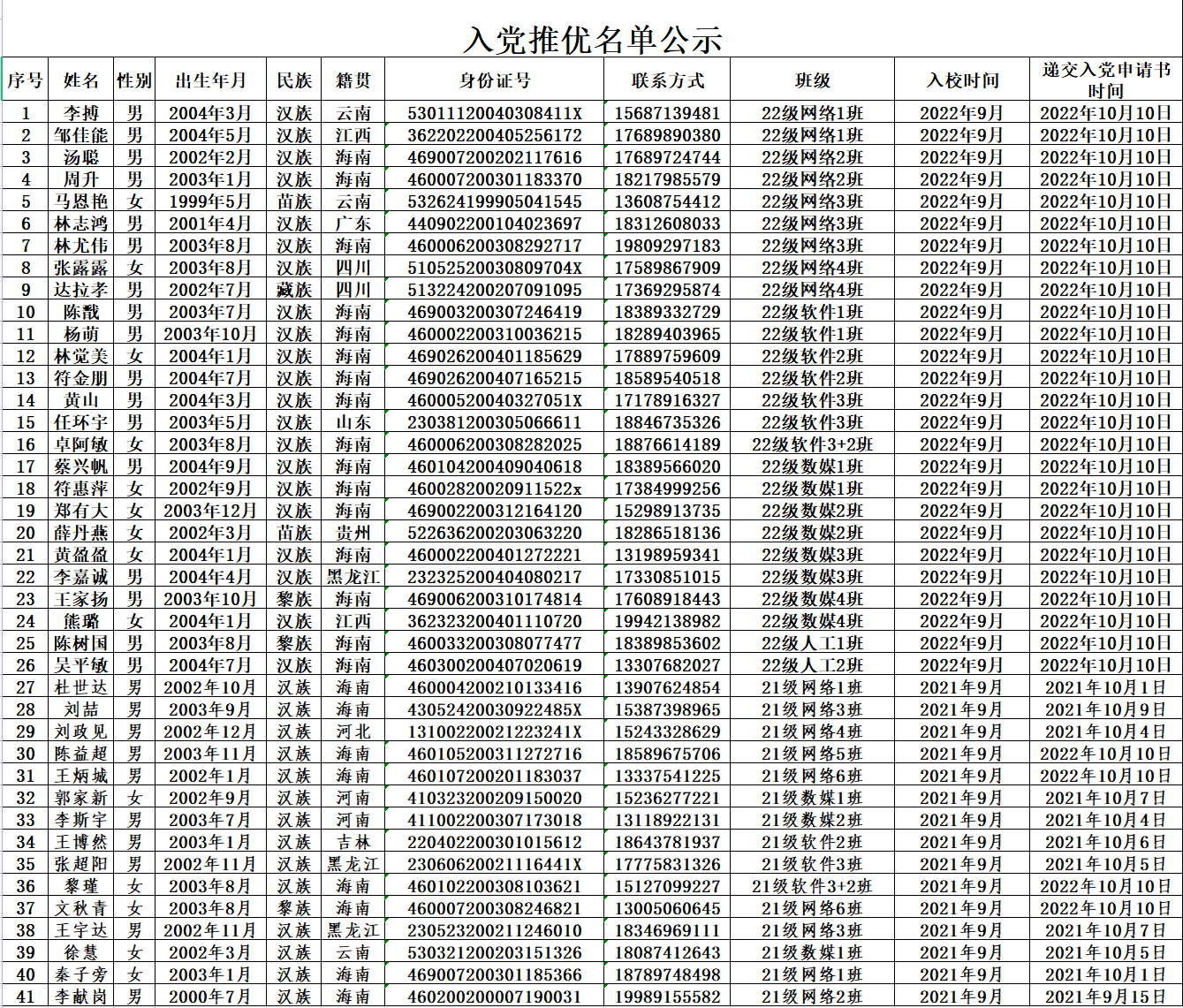 根据《进一步规范和加强公司推荐优秀共青团员入党工作的通知》、《中共中央组织部、共青团中央委员会关于进一步做好推荐优秀团员作党的发展对象工作的意见》、《中共中央组织部关于进一步加强在青年中发展党员工作的意见》、《中共中央组织部、中共中央宣传部、中共教育部党组关于进一步加强高校员工党员发展和教育管理服务工作的若干意见》、《共青团推优入党工作实施办法(试行)》等文件要求,并结合《WilliamHill官方网站关于推荐优秀团员作为党的发展对象工作实施办法》的文件精神。经各团支部民主推荐,二级公司团总支审查,校团委审核并公示。2022年11月推优入党名单如下:(41人)