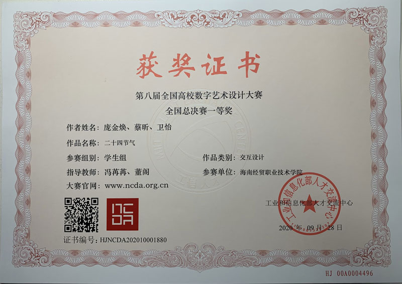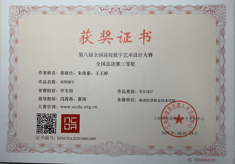 2020年7月指导员工参加2020年由工业和信息化部人才交流中心、联合国训练研究所上海中心主的“NCDA Awards第八届全国高校数字艺术设计大赛”,数字媒体董阁老师获得 “交互设计类别”全国一等奖1项和全国“三等奖”1项。