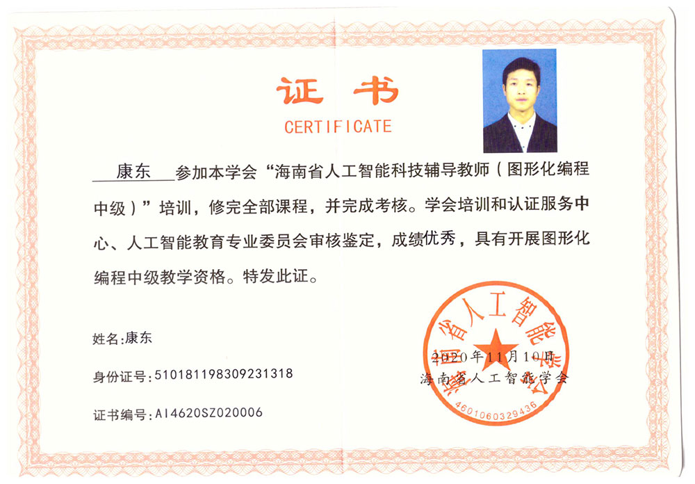 10月17-25日举办"2020年海南省中小学人工智能科技教学培训班(图形化编程中级)",以"专家讲授+考核评价"的方式开展。培训结束考核通过者可获得由海南省人工智能学会颁发的《教学资格证书(图形化编程中级)。