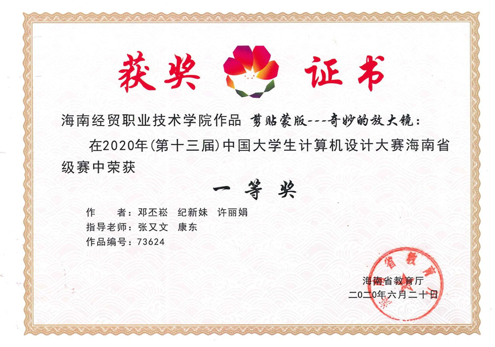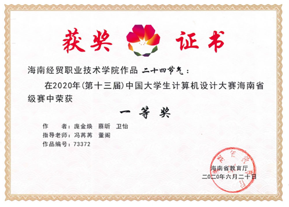 2020年6月20日中国老员工计算机设计大赛海南省级赛落下帷幕,本次海南省赛共计参赛的有本科163个作品和高职组有67个作品,经过激烈角逐,数字媒体学子脱颖而出,分别获得一等奖2项、二等奖2项、三等然6项。