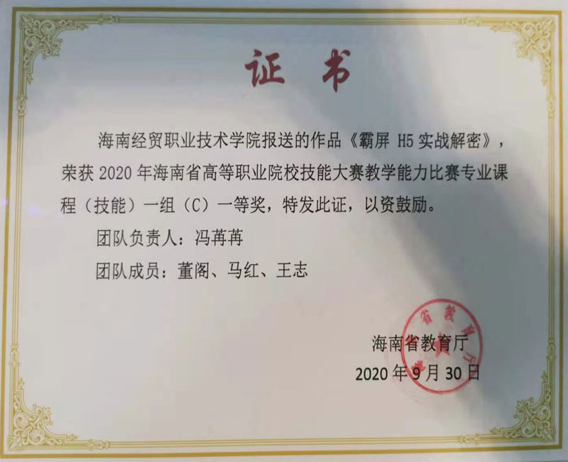 2020年8月参加全国职业院校技能大赛教学能力比赛,数字媒体董阁老师荣获海南赛区“一等奖”。