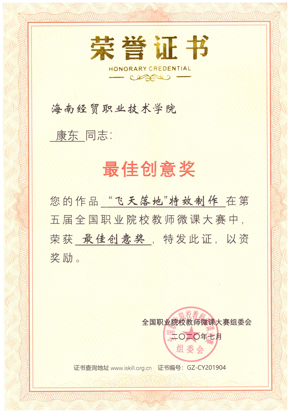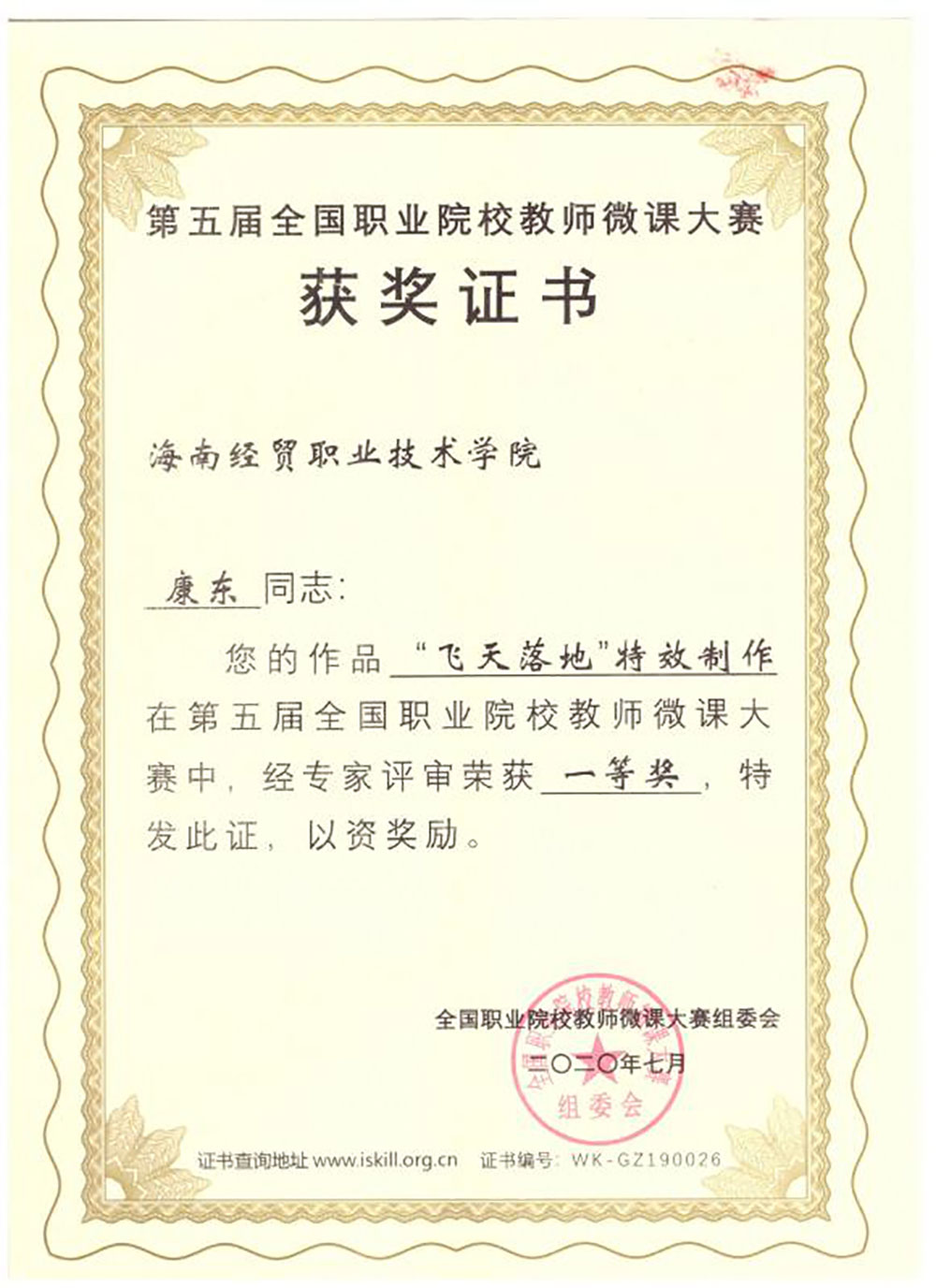 7月,第五届全国职业院校教师微课大赛评选结果揭晓。康东老师获得2020年第五届全国职业院校教师微课大赛一等奖,以及2020年第五届全国职业院校教师微课大赛最佳创意奖,马清老师获得三等奖。