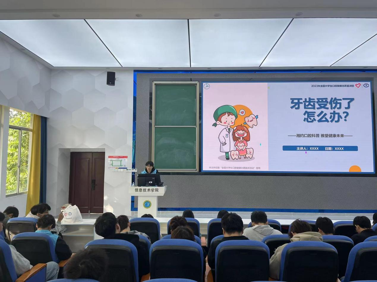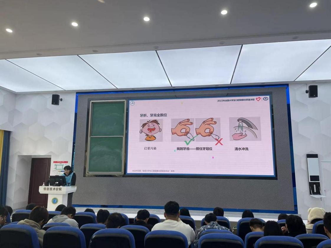 口腔健康是人体健康的重要组成部分,它涉及我们每天的饮食、呼吸、交流等方方面面。但是,很多人对口腔健康的重要性并没有足够的认识,甚至存在一些错误的认识和习惯。海经贸口腔健康志愿宣讲团为了将“掌握口腔常识,让你的牙齿更健康”的理念传递出去,增强同学们维护口腔健康的意识。12月24日下午,在4-215开展口腔健康宣讲活动,和同学们一起了解牙齿受伤了怎么办。