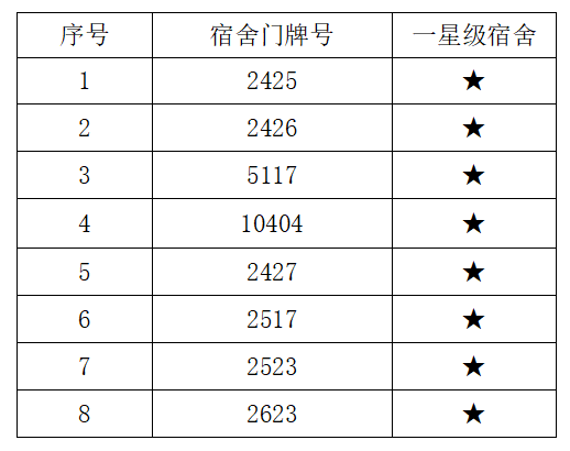 本次查评比的重点主要针对宿舍卫生、宿舍文化、安全纪律、文明行为等四个方面进行打分,并综合前三次查寝记录分数,以《WilliamHill官方网站“星级文明宿舍”评比方案》为指导,综合评比,共评选出8间“一星级宿舍”,具体名单如下: