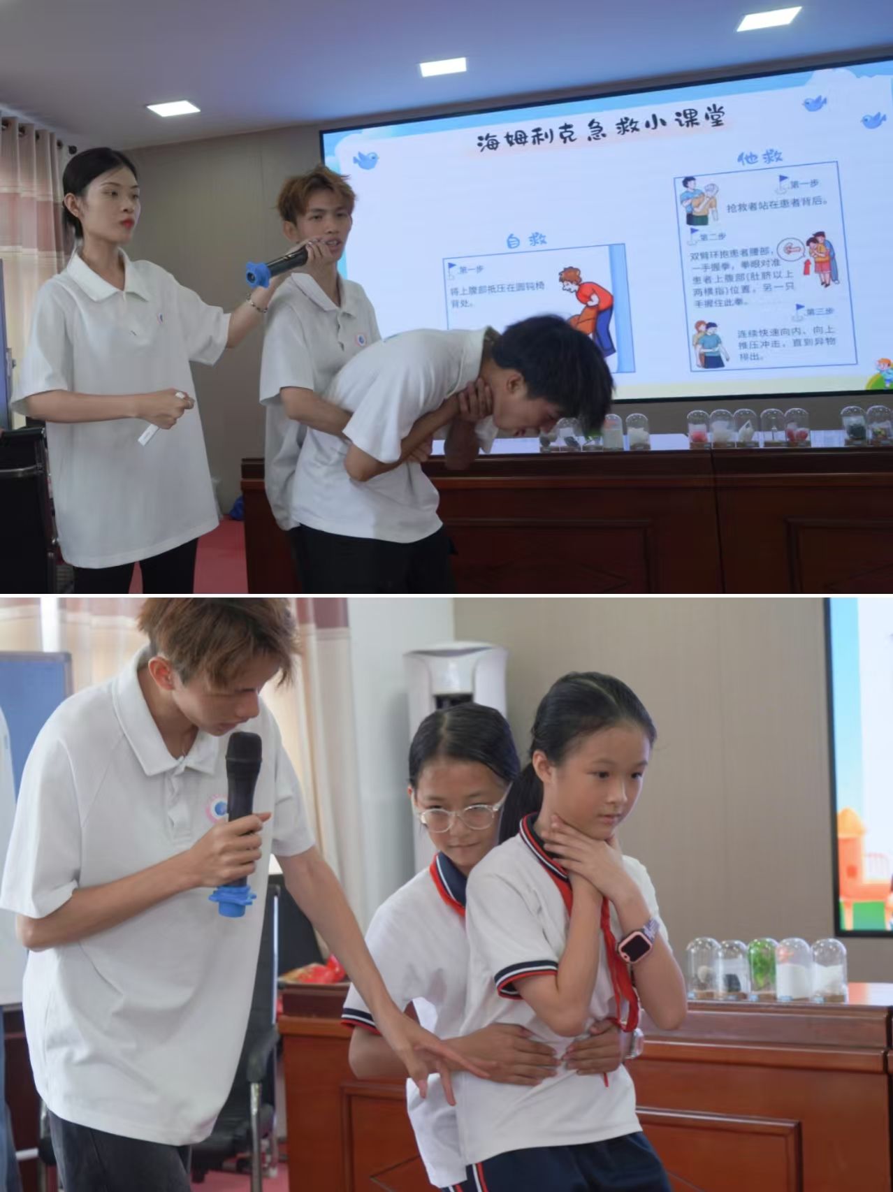 宣讲环节紧扣“安全三防”“食品安全”“毒品危害”“交通安全”四个主题,以理论与实操深度融合的模式,让知识真正实现“入脑入心”。在安全三防课堂,宣讲团成员先抽丝剥茧般拆解灭火器原理与使用步骤,随后以“提拔握压”的简单口诀,引导孩子们登台实操,借扑灭模拟火源的过程,让灭火技能化作沉浸式体验;紧接着以人体模型为依托,清晰演示心肺复苏按压、人工呼吸等关键动作,再邀请孩子们亲身实践,稳稳筑牢急救知识根基。