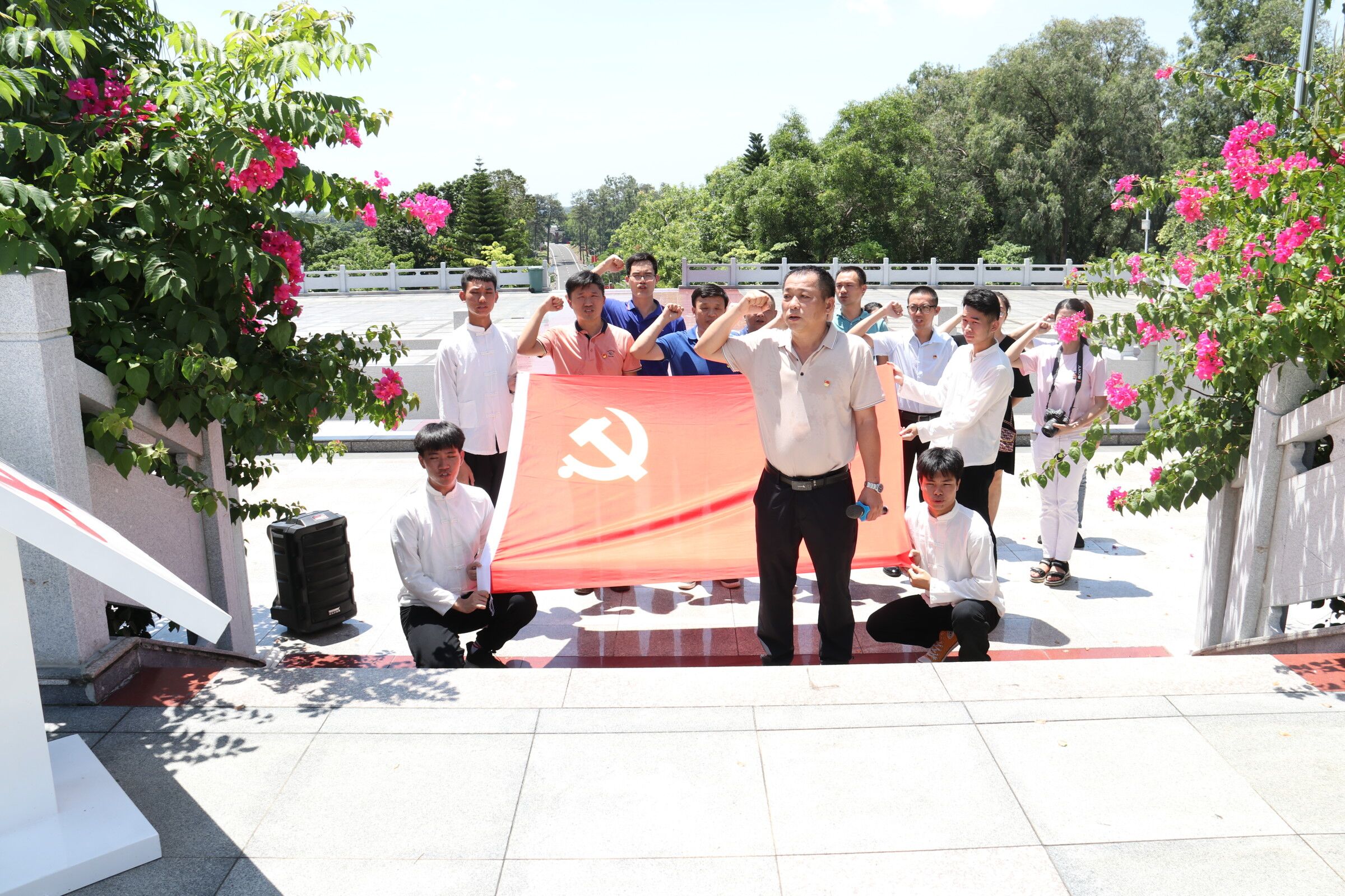 紧接着,全体人员列队沿阶而上,在呈方形塔状的六连岭“革命烈士永垂不朽”纪念碑前肃立默哀,鞠躬致敬。在公司党总支孙金书记领誓下,公司全体教师党员面向党旗庄严宣誓,以铿锵有力的声音重温入党誓词,在铮铮誓言中坚定革命理想,不忘入党初心。