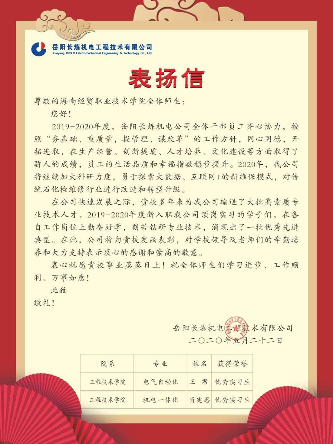 近日,2017级机电一体化专业的肖宪思,电气自动化专业的王君获得了岳阳长炼机电工程技术有限公司颁发的“优秀实习生”称号。
