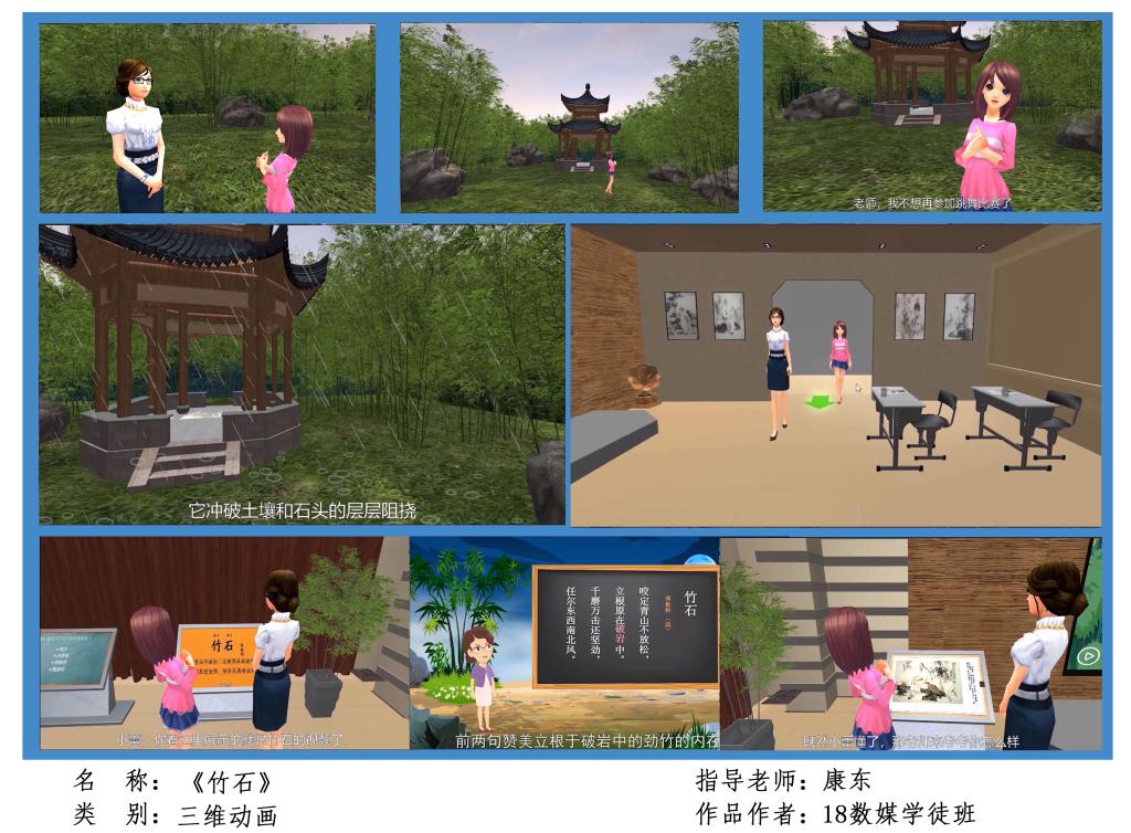 2018级数字媒体专业的同学充满自信,向老师同学们展示自己的作品。他们通过自己的作品展现与感慨大学的乐趣、收获与遗憾。比如《疫情防范知识》作品以手机H5形式呈现,生动有趣的交互,形式多样的页面,普及新冠肺炎的防范知识。三维动画微课毕业作品《竹石》以小女孩小蕾因为练习舞蹈辛苦无法坚持,通过老师的耐心劝导与微课“竹石”的学习,从诗词《竹石》与了解作者“郑板桥”的事迹后,明白了面对困难坚持不懈,毫不退缩的精神态度。平面毕业作品《抗疫宣传手册》则以平面手册的形式宣传了目前防疫抗疫的知识方法,配以大量卡通图片让人一目了然,简单易懂。影视广告作品《可口可乐》通过情侣篇、生活篇、运动篇三个小广告来展现可口可乐的激情生活,剪辑流畅,构思新颖,活泼生动。本次毕业答辩比赛共计有48个作品参与角逐,形式多样,丰富多彩,赢得了老师同学们的喝彩和掌声。同学们还与观众们展开了积极互动,活动气氛十分活跃。