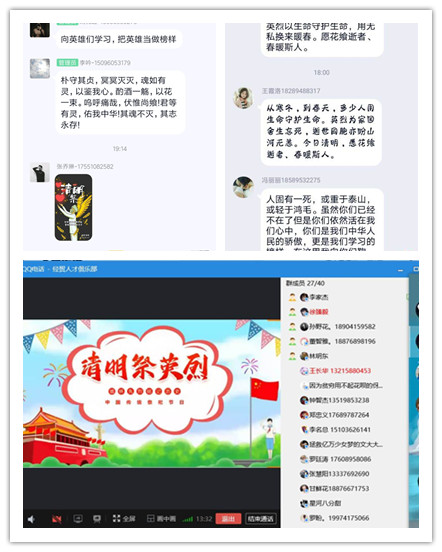 由于疫情的原因,今年的清明祭奠是特殊的,也是让同学们映像深刻的,公司学子们通过在朋友圈或者QQ空间等网络平台发表自己感想的方式祭奠英烈和逝世同胞,表达自己对英烈的敬拜;对祖国尽快战胜疫情、我们的生活越来越美好的温馨祝愿之情。