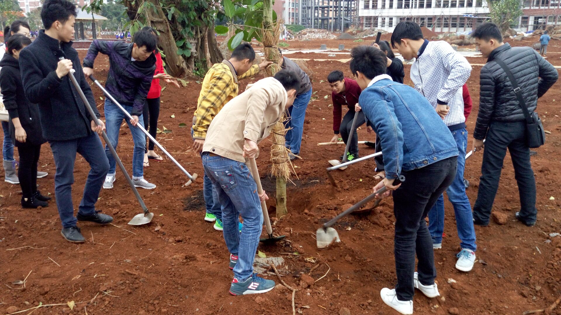 一到现场,老师和同学们便几个人一组,投身于植树活动中,尽管天空下着小雨,可是大家的激情未减,有的铲土挖坑、有的手扶树苗,有的填土压实,忙的不亦乐乎。一棵棵树苗在大家的相互配合下站直了身躯,大家脸上都洋溢着快乐的笑容,希望来年会绿树成荫。