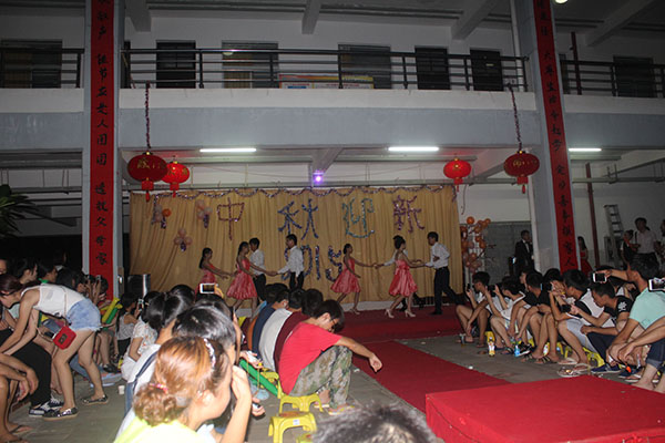 晚会由交谊舞作为开场秀拉开了帷幕。接着一个又一个的节目陆续演绎,有独唱、合唱、歌曲串烧、小品、快板、朗诵、舞蹈等等,精彩的节目赢来在场观众的掌声不断,喝彩声不断。节目中间还穿插些小游戏,由一些同学上台配合玩,还为每一个上台的同学分发中秋小礼品,互动的小游戏让同学们完全沉浸在了晚会的快乐气氛中。生动有趣的节目充分的展现了同学们的文艺才情,最后由合唱一首《朋友》使晚会圆满结束。