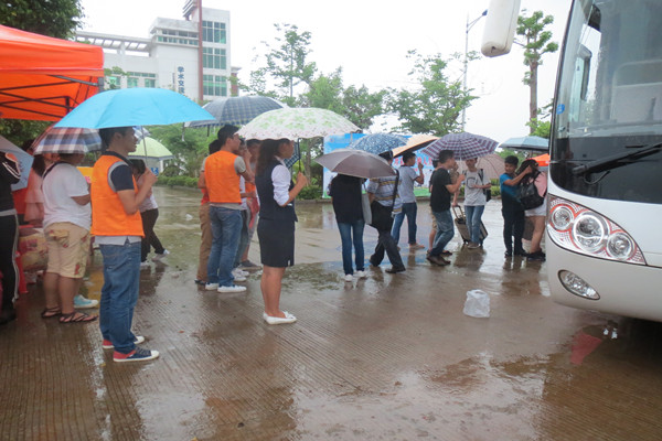 上午8时左右,海口的天气像娃娃的脸,说变就变,雨时大时小的下个不停,公司大门口淅淅沥沥的雨水却显然没有影响学长学姐们迎接学弟学妹的热情。接站的车辆一驶进校区,他们就立刻行动起来,不顾雨大水深,接过新生手中沉重的行李,引领他们到二栋教学楼楼下系部新生接待处,并热情的给家长们搬凳子提供休息、倒水,让其在避雨途中稍做休息,安排好父母然后再带学弟学妹们去办各种手续。办理程序完后,便送他们回员工宿舍楼。