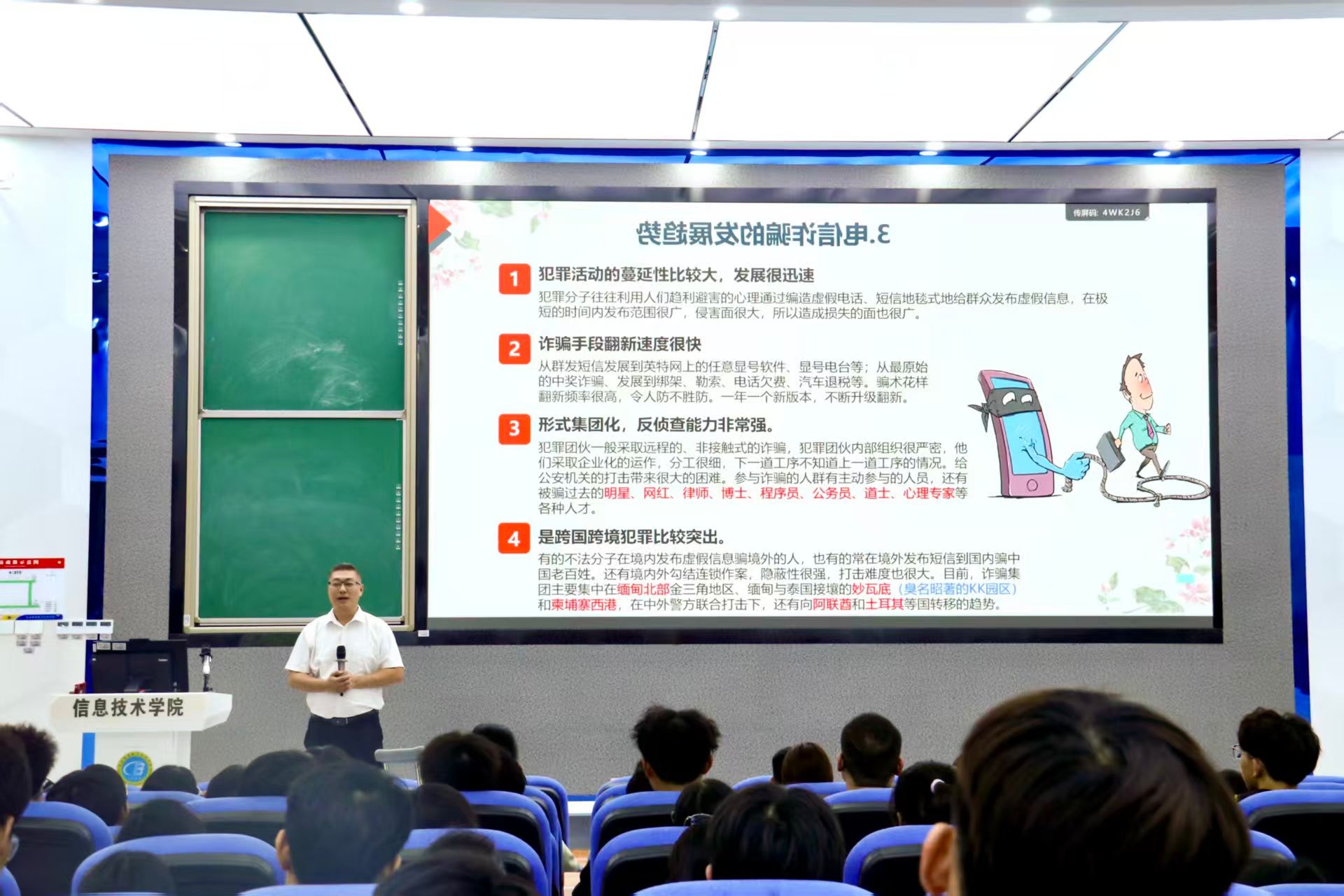 讲座伊始,黄守官副书记结合当前电信诈骗的高发态势,明确指出了开展此次防范教育的重要性与紧迫性。他从“什么是电信诈骗”切入,详细阐释了电信诈骗是以非法占有为目的,利用手机短信、电话、网络等传播媒介,虚构事实或隐瞒真相骗取数额较大公私财物的非接触性诈骗行为,让新生对诈骗本质建立起清晰认知。
