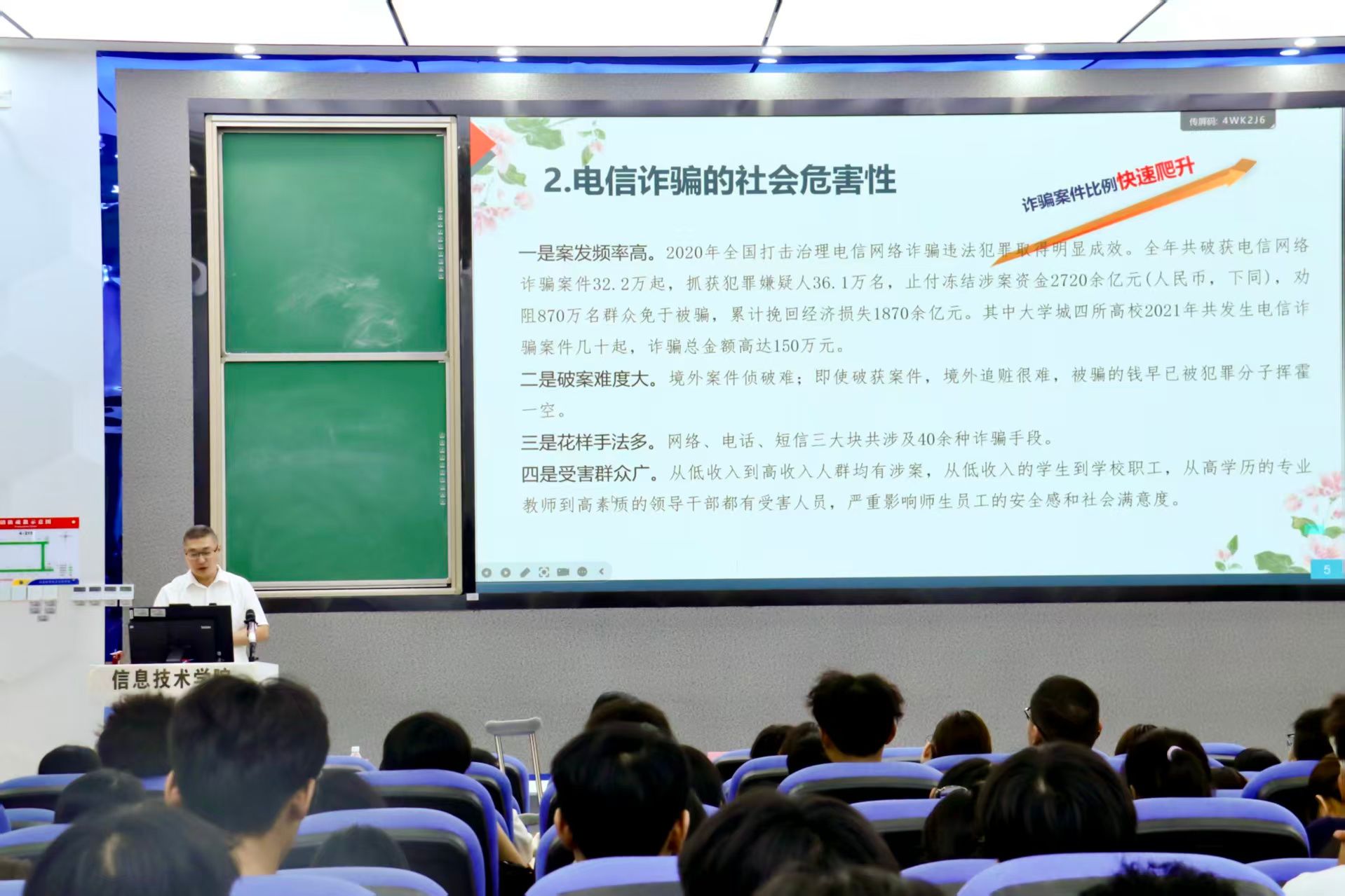 随后,黄副书记重点剖析了电信诈骗的社会危害性。他援引数据指出,此类案件案发频率高,仅大学城四所高校2021年就发生数十起,涉案金额高达150万元,同时还具有破案难度大、诈骗手法多、受害群众广等特点,严重影响师生安全感与社会满意度。针对新生群体易受骗的特点,他系统讲解了五大类常见诈骗形式,包括以刷单、虚假中奖为代表的“钓鱼类”诈骗,针对情感需求的“美人计”诈骗,冒充客服、领导的“冒充类”诈骗,以及恐吓类和连环套诈骗,并结合多个真实案例深入拆解了每类骗局的操作流程与迷惑点。